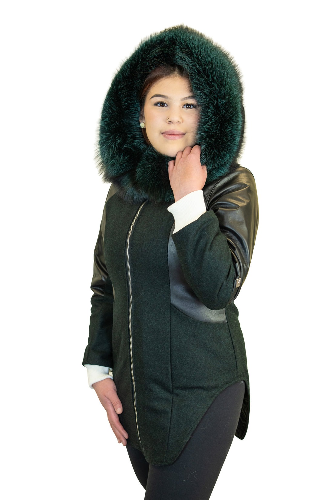 A dyed green fox fur hood trim adds a touch of luxury while offering practical protection against cold winds. Accent zippers along the front and matching pocket zips enhance the visual appeal of the Wool and Leather Winter Parka, blending style and utility seamlessly.